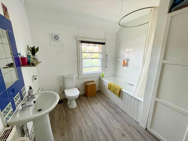 Sash window, radiator, extractor fan, part tiled walls, cast Iron fireplace, pedestal wash hand basin, low level WC, panel enclosed bath, independent Mira shower unit.