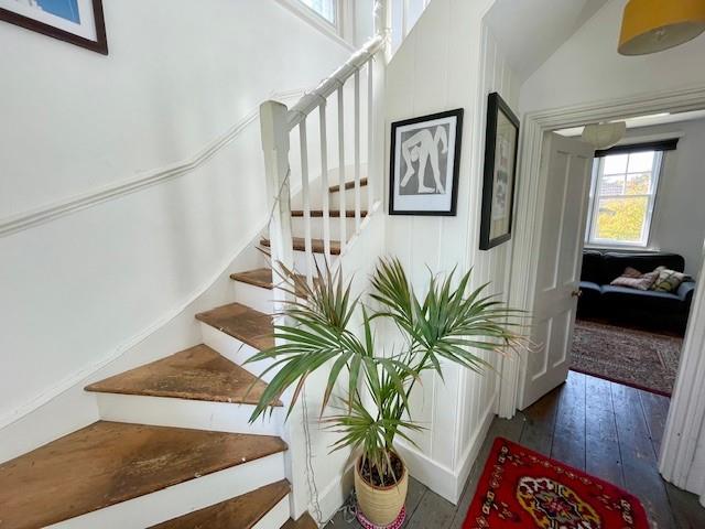Sash window, staircase leading to first floor, radiator, stripped wooden floorboards, wood panel doors to: