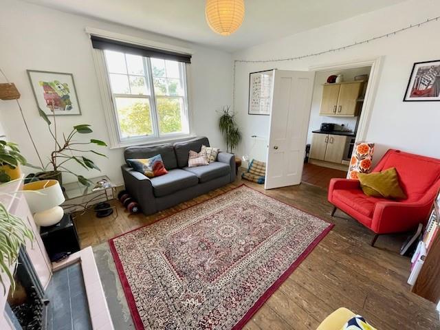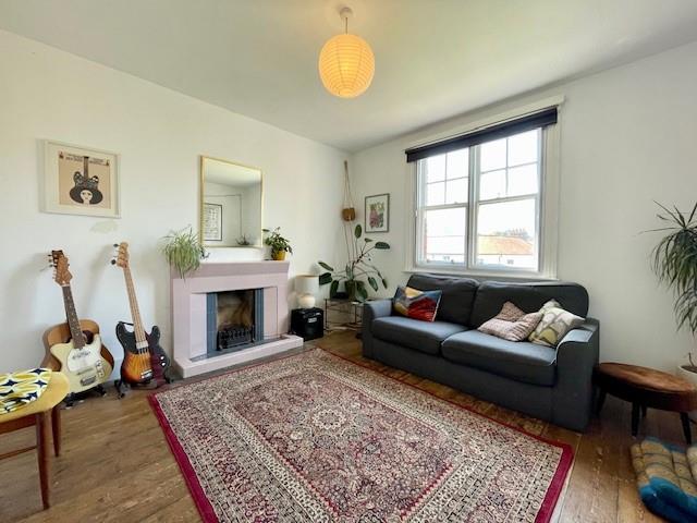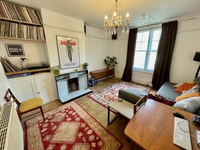 Sash window, stripped wooden floorboards, tiled fireplace, picture rails, storage cabinet, radiator.