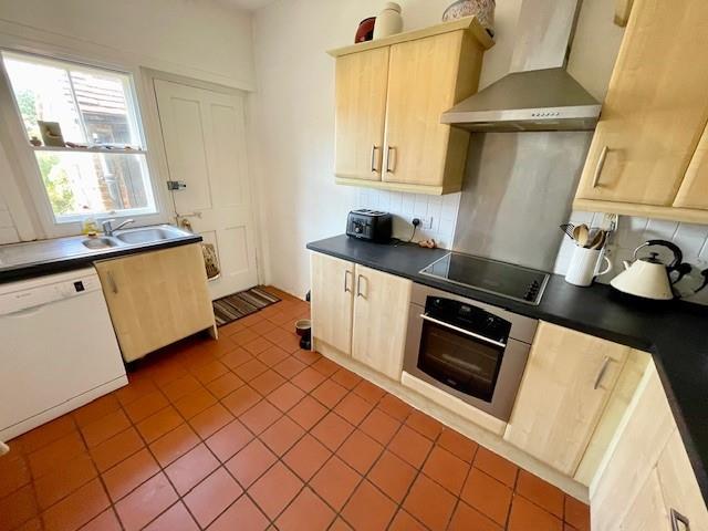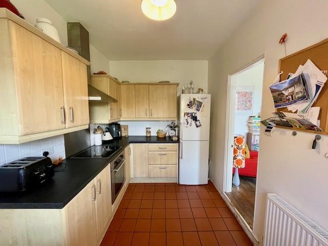 Sash window over looking rear garden, tiled flooring, radiator, part tiled walls, modern kitchen units with matching drawers, granite effect rolled edge working surfaces, inset stainless steel sink unit, integral four ring hob with matching oven & canopied extractor hood, wall mounted gas boiler, space & plumbing for washing machine, space for tall fridge freezer, rear door to garden.