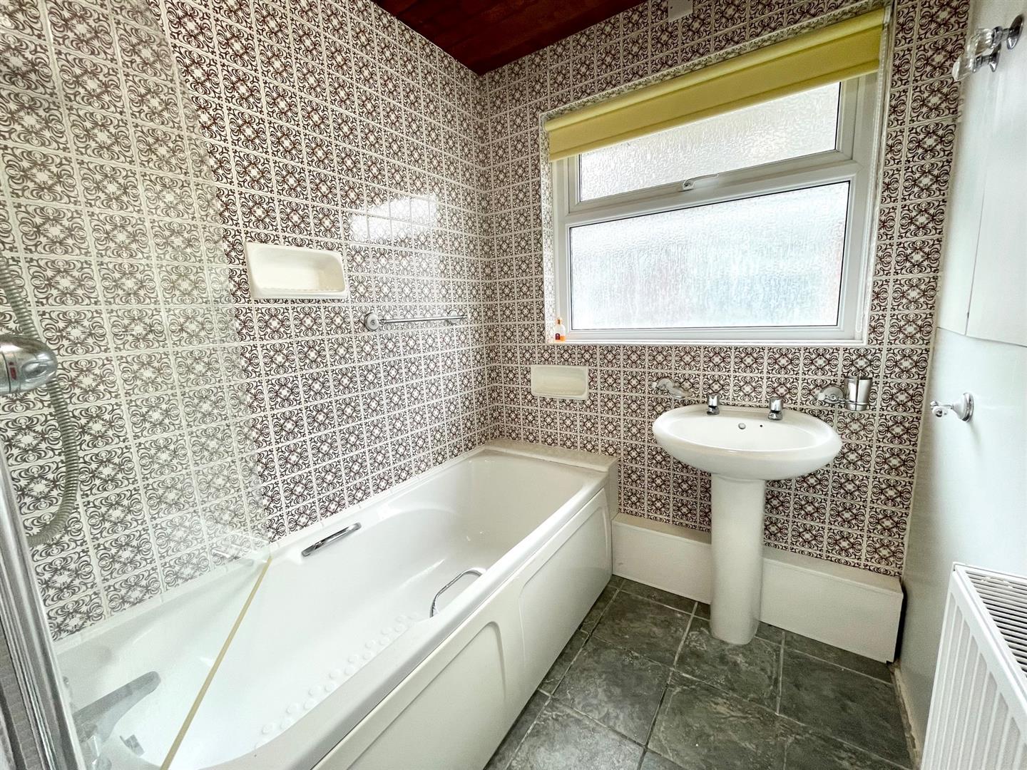 Double glazed window with patterned glass, fully tiled walls and flooring, radiator, airing cupboard housing Worcester combi boiler, pedestal wash hand basin, panel enclosed bath with mono mixer tap, thermostatic mixer shower with bi-fold glazed screen.