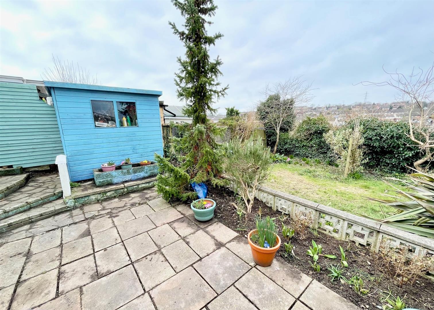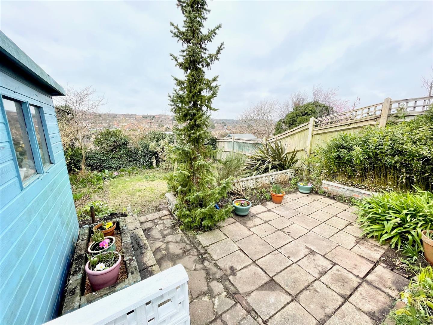 Raised patio area adjacent to rear of property with steps leading down to remainder of garden which is laid to lawn in part bordered by well stocked flower beds and shrubs, additional patio area, timber garden shed, gated side access.