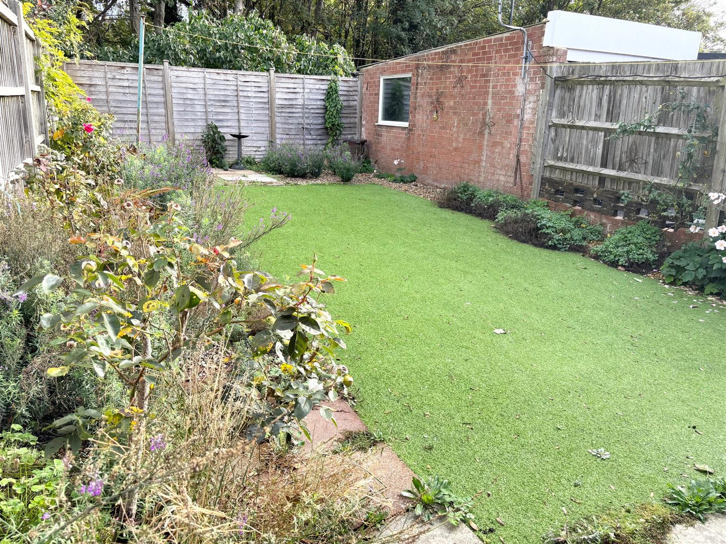 neatly laid with artificial lawn, flower and shrub beds fenced on all three sides, side gate