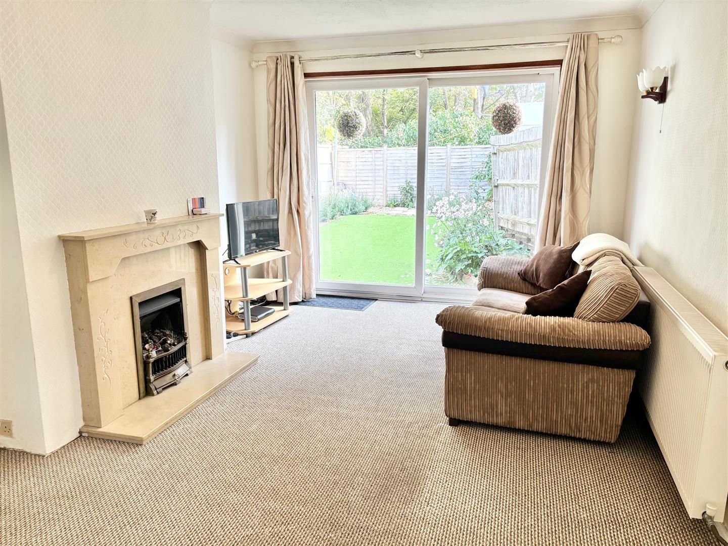 feature fire place with a marble style inset, hearth and mantel, radiator, coving, two wall lights, sliding upvc double glazed patio doors to the garden