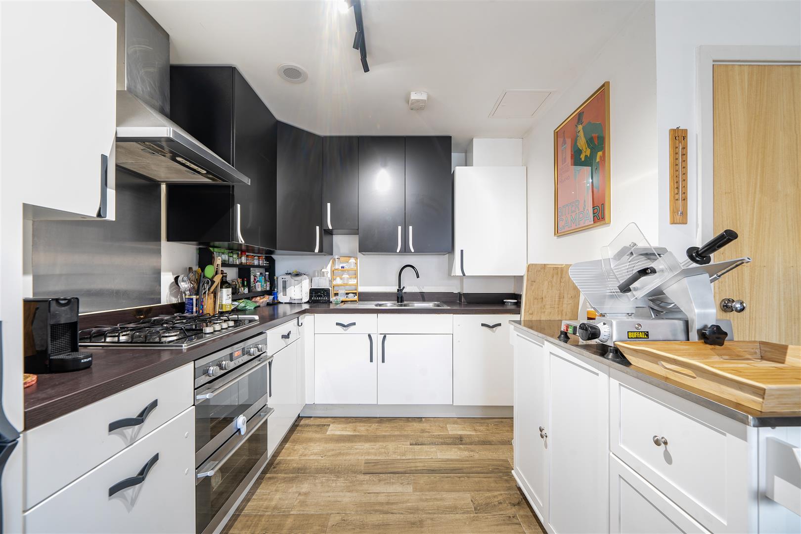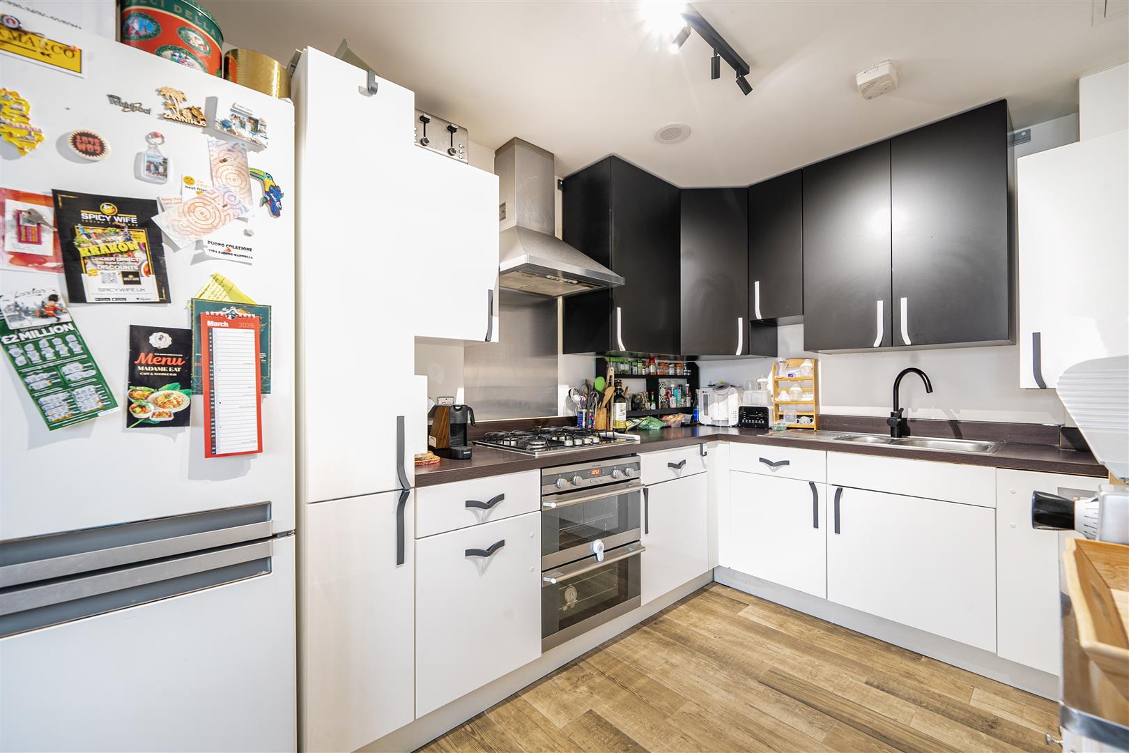 fitted with matching white gloss and black matt units and comprising of a 1 1/2 bowl inset sink unit, adjacent working surfaces, base and eye level units, INSET FOUR RING GAS HOB, FITTED EXTRACTOR HOB OVER, BUILT IN ELECTRIC DOUBLE OVEN AND GRILL, cupboard housing a gas fired combination boiler, tiled floor