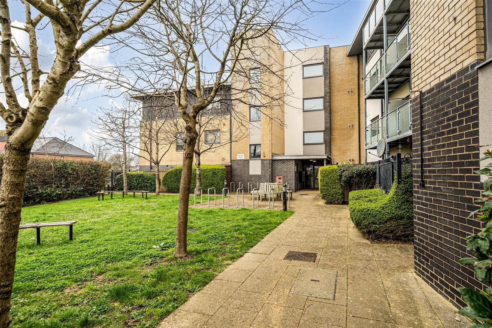 Communal entrance via a security entryphone system, front door to