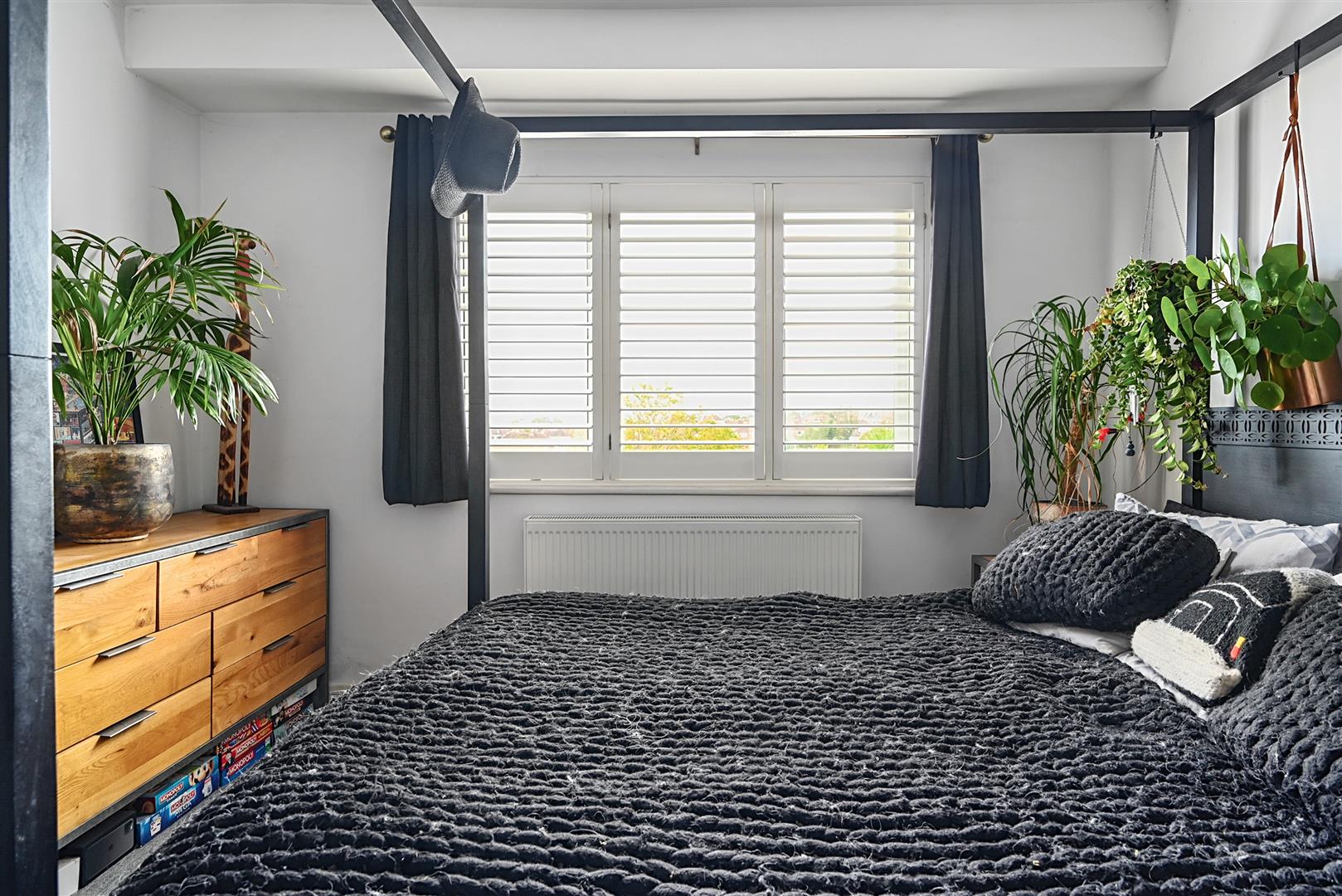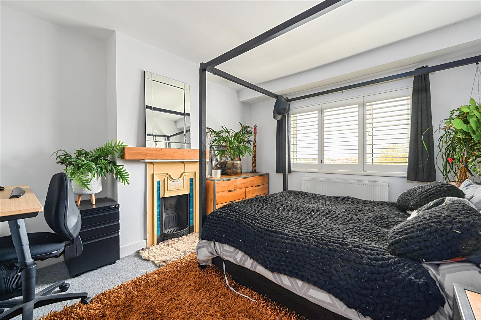 Feature fire place with a cast iron inset and wood mantel, radiator, upvc double glazed window with made to measure shutters