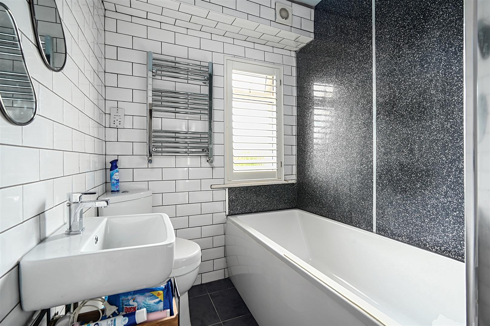 A white suite comprising of a panelled bath with a separate overhead shower and glass shower screen, wash hand basin, low level wc, part tiled walls, tiled flooring, ladder style heated towel rail, extractor fan, frosted upvc double glazed window with made to measure shutters