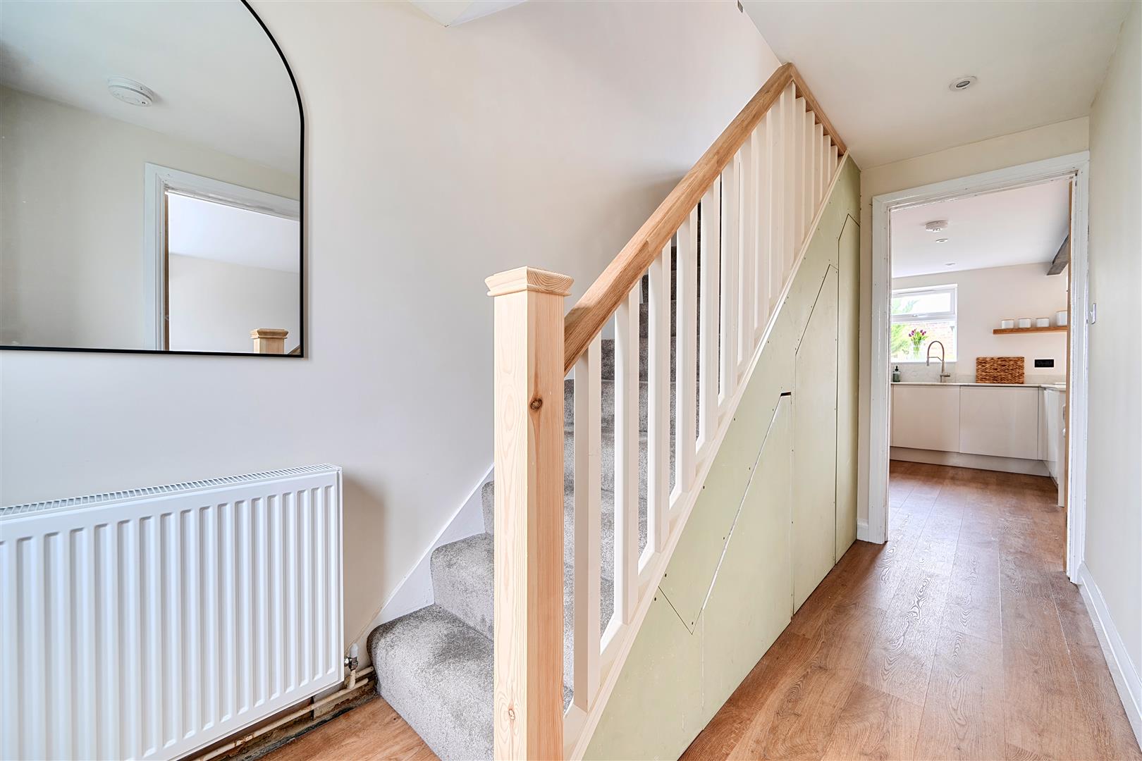 via a frosted upvc double glazed composite door, stairs to the first floor, cupboard with space and plumbing for the washing machine, under stairs storage cupboards, inset downlighters, doors to
