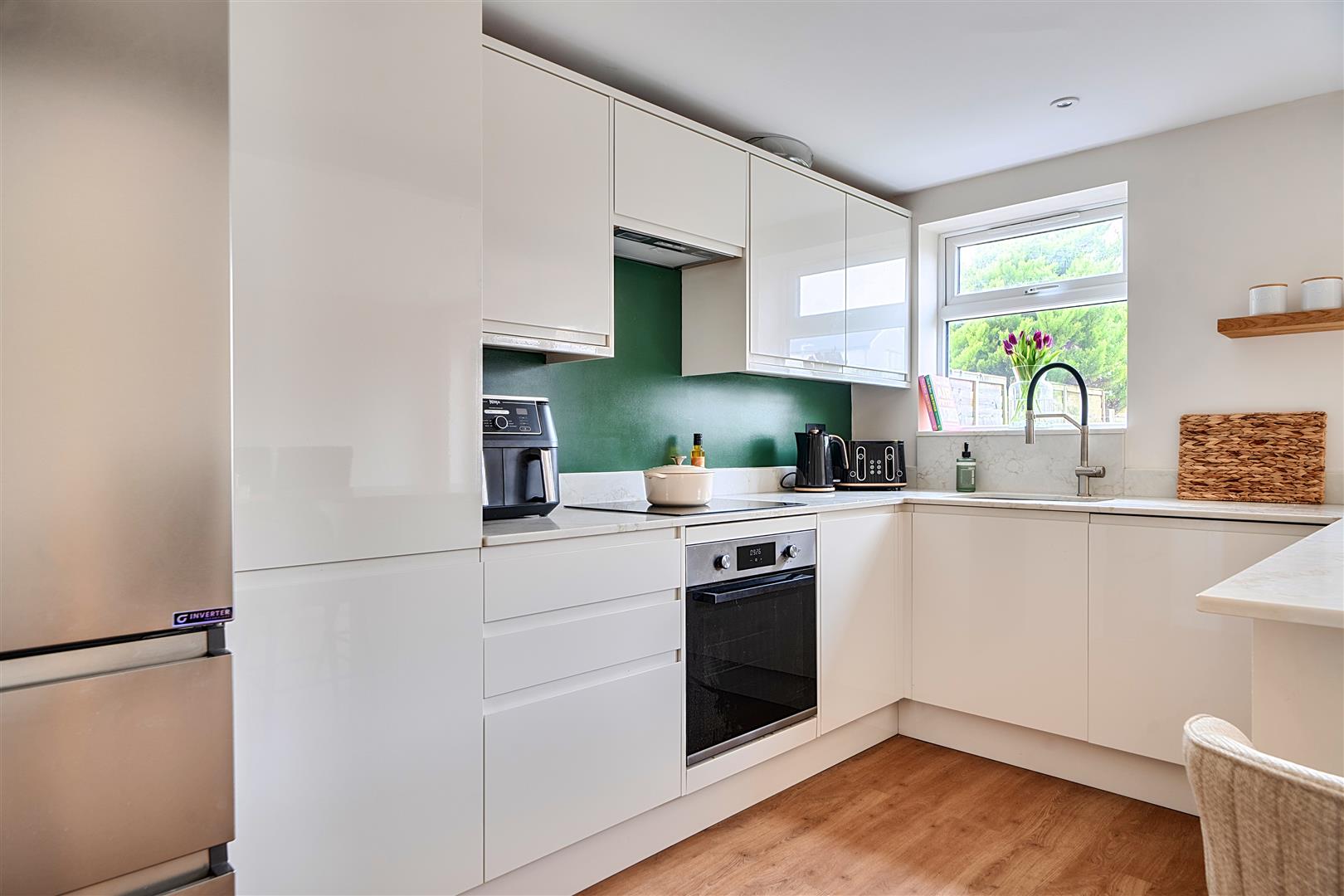 fitted with new matching white gloss handle-less units and comprising of a 1 1/2 bowl inset sink unit, adjacent QUARTZ working surfaces, base and eye level units, BREAKFAST BAR, INSET INDUCTION HOB, BUILT IN ELECTRIC FAN ASSISTED OVEN AND GRILL, EXTRACTOR HOOD OVER, INTEGRATED DISHWASHER, space for fridge freezer, under unit LED lighting, inset downlighters, luxury vinyl floor tiling, upvc double glazed window