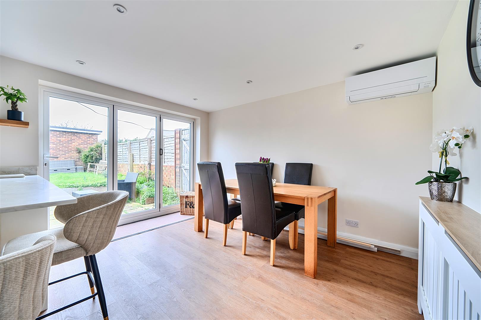 ample space for a table, radiator, inset downlighters, luxury vinyl floor tiling, BI-FOLD doors to the garden